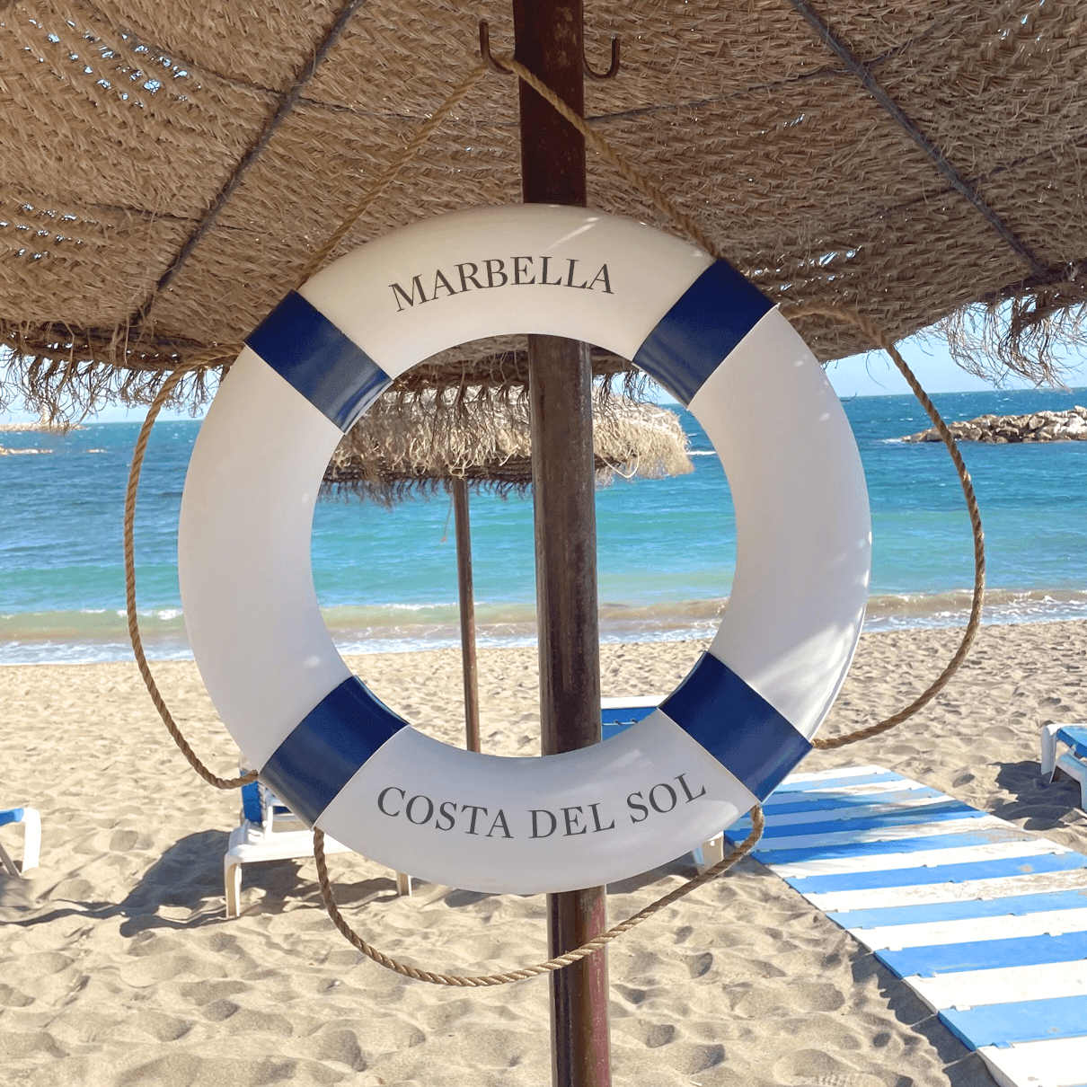 Además de escoger el color puedes escribir tu propio texto tanto en la parte superior como inferior del aro salvavidas. Puedes poner tu nombre o el nombre y las coordenadas de un lugar. Recomendamos un máximo de 12 letras por fila que aparecerán con el tipo de letra Mercury y en mayúsculas. Si quieres añadir más letras o incluir coordenadas déjanos un mensaje en el Carrito de compra.