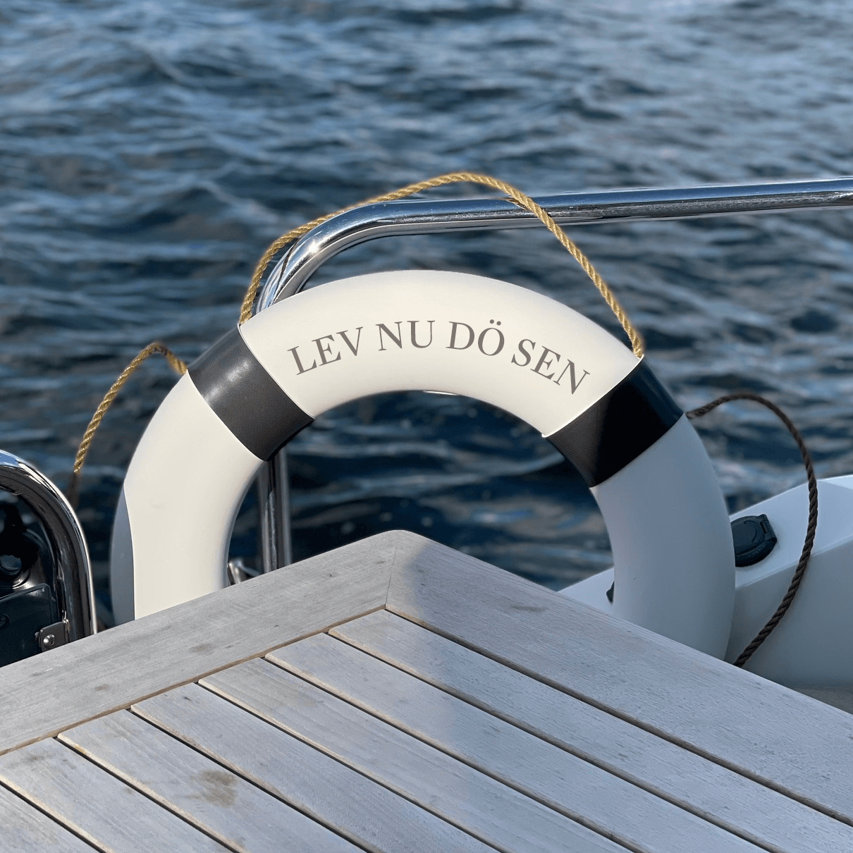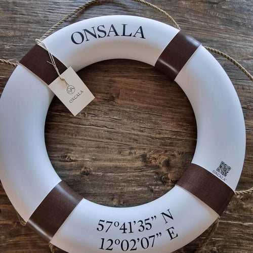 Además de escoger el color puedes escribir tu propio texto tanto en la parte superior como inferior del aro salvavidas. Puedes poner tu nombre o el nombre y las coordenadas de un lugar. Recomendamos un máximo de 12 letras por fila que aparecerán con el tipo de letra Mercury y en mayúsculas. Si quieres añadir más letras o incluir coordenadas déjanos un mensaje en el Carrito de compra.
